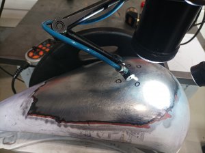 Tahle nádrž byla hodně promáčklá tak se to muselo nejdřív vytáhnout spotovačkou a pak ručně klempířská babka a kladívko. Teď to je už na 95% hotové. Na to pájení jsem koukal na nějaká videa na YT a i když to dělal třeba stříbrem, nebo olovem tak ten materiál musel hodně prohřát propan butanovým hořákem aby se hezky rozlil přídavný materiál. Druhý problém je že si každou dírku ještě zatlačil důlčíkem dovnitř aby mu tam vznikla jakási miska kterou pak vypájel. Ale tím se udělá další nerovnost.
